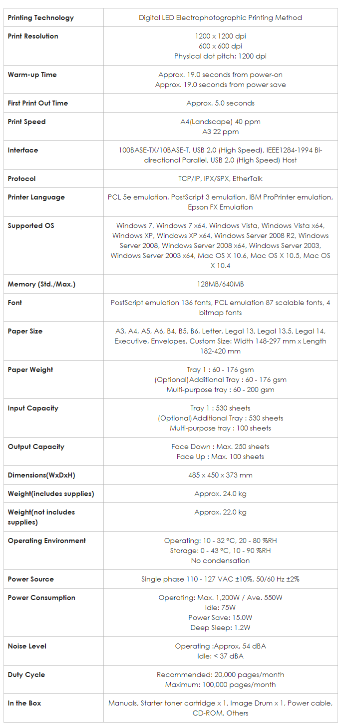 ● 黑白列印速度: A4每分鐘 40 頁;A3每分鐘 22 頁