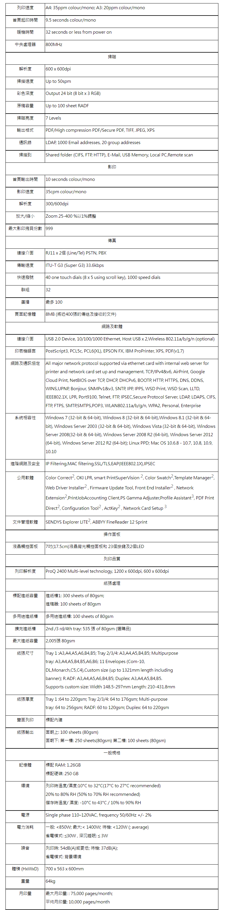 ● 列印速度: A4每分鐘 35 頁:A3每分鐘 20 頁